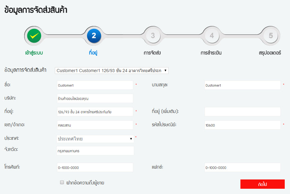 4. ในกรณีที่กดปุ่ม ชำระเงิน ระบบจะแสดงข้อมูลการจัดส่งสินค้า ให้คุณกรอกชื่อที่อยู่สำหรับติดต่อ และ ชื่อที่อยู่สำหรับจัดส่ง จากนั้นกด ถัดไป