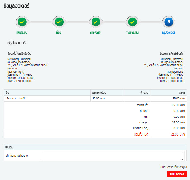 หมายเหตุ ระบบมีการส่งอีเมล์สรุปข้อมูลการสั่งซื้อไปให้ทางคุณและทางร้านค้า เพื่อให้ทางร้าน ค้ารับทราบออเดอร์และดำเนินการจัดส่งสินค้าต่อไป